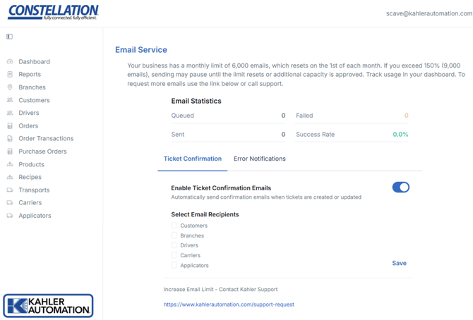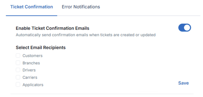 Tickets can automatically be emailed to customers, branches, drivers, carriers, and applicators as configured when a ticket is dispensed. To receive an email, each entity must have an email on record, and the email service must be enabled.