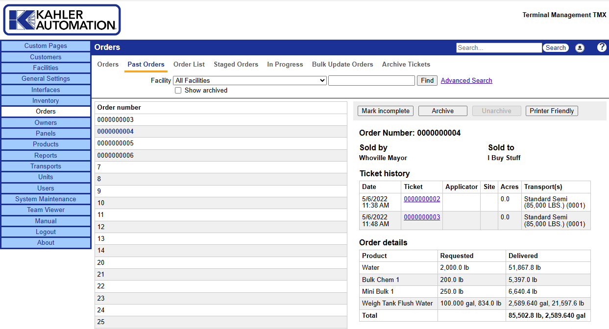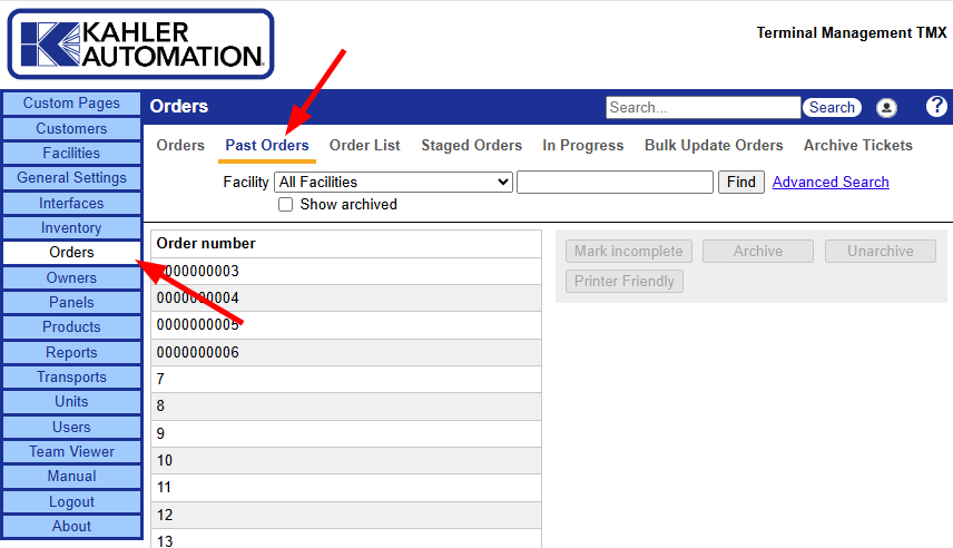 Once an order is marked complete, either manually or automatically, Terminal Management TMX will move the order into “Past Orders.” “Past Orders” is found in under the Orders section on the blue navigation bar (shown below).