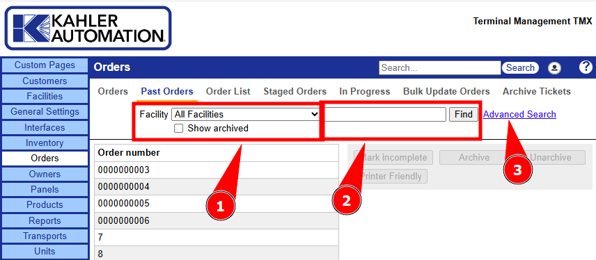 Accessing past orders in Terminal Management TMX may be required for reprinting tickets or review.