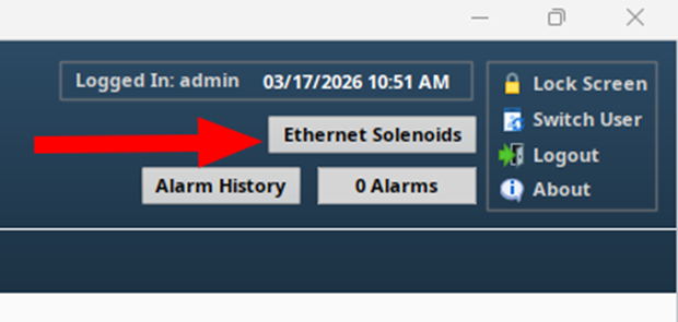 In the top right of the FLEXCOMMAND HMI view, a button gives access to the Ethernet Solenoid Diagnostics window.