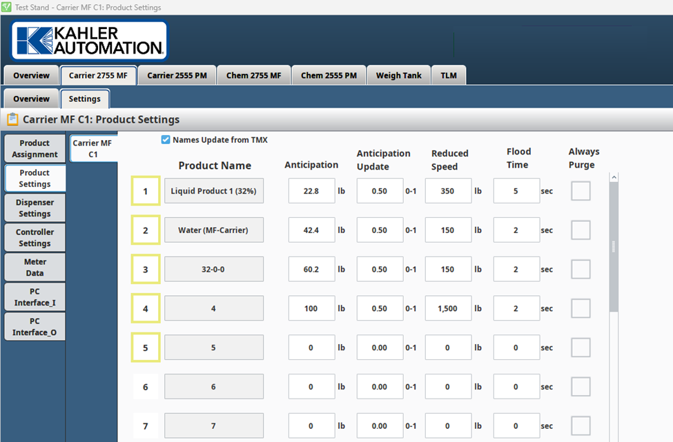 If the box is checked, the product names are grayed out and are updated from TMX. Updates occur only when either PSX or SS2 is assigned to the controller, and the application is started.