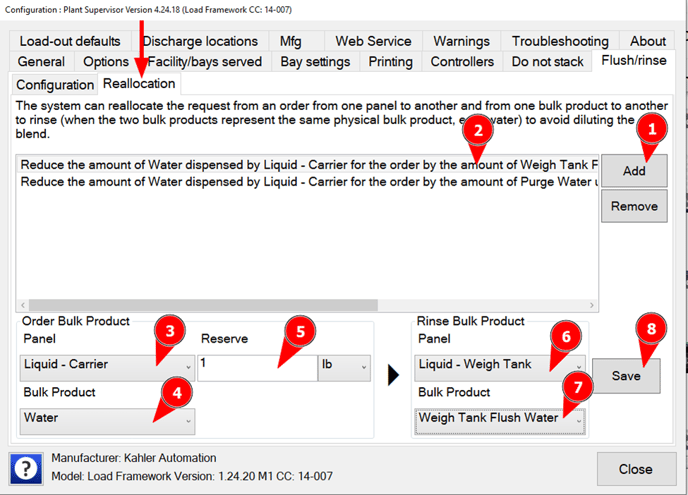 Once Flush/Rinse has been configured, select the “Reallocation” tab under “Flush/Rinse” as shown. This page will configure reallocations the system can use.