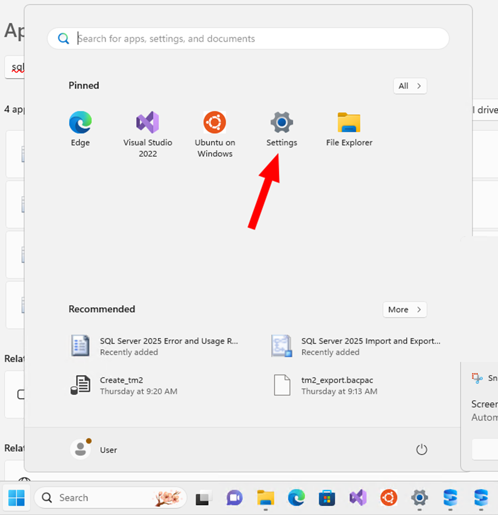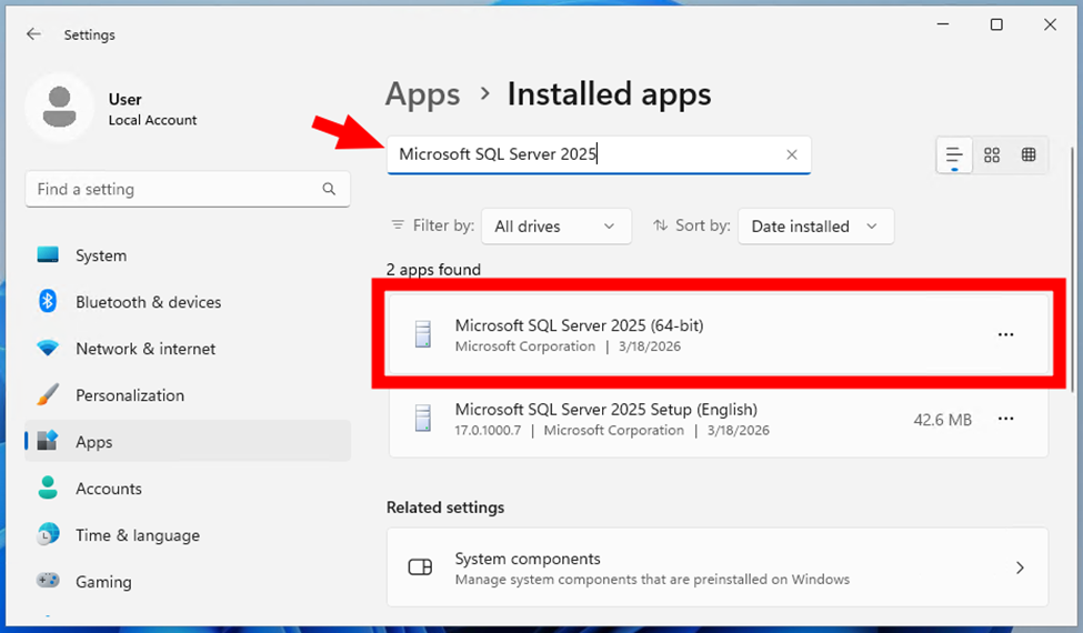 - Search for “Microsoft SQL Server 2025”. If installed, it is listed. If not listed, you should see “Microsoft SQL Server 2022” installed instead.