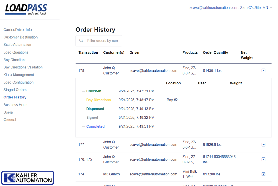 Order History is available to all LOADPASS facility operators, both Admin and Limited roles.