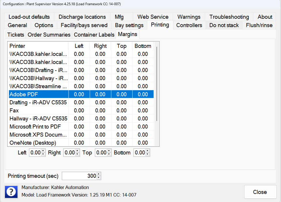 Plant Supervisor PSX’s printing configuration includes a tab for setting margins for each installed printer. When printing, Plant Supervisor PSX will utilize the maximum of the configured margin, and the printer’s reported margins.