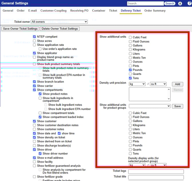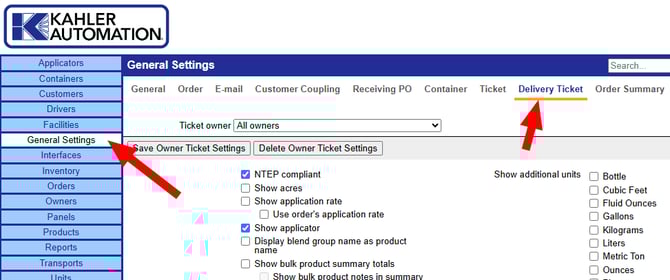 The appearance of printed tickets (sometimes called receipts or Bill of Lading (BOL)) can be customized in Terminal Management TMX to display information required by a company. Users can either change the settings for all owners or a specific owner. To modify tickets to show additional information, navigate to “General Settings” within Terminal Management TMX and then “Delivery Ticket”.