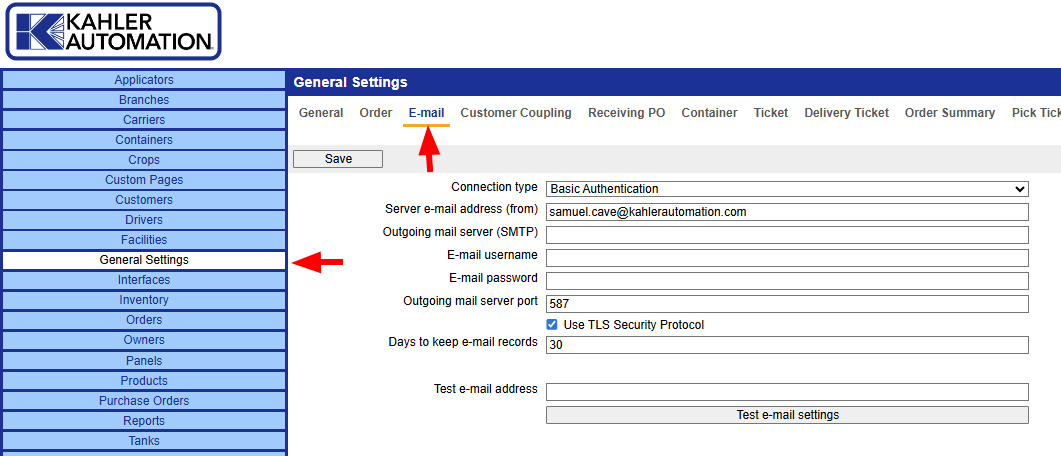 In Terminal Management, navigate to the General Settings menu, then select the E-mail tab.